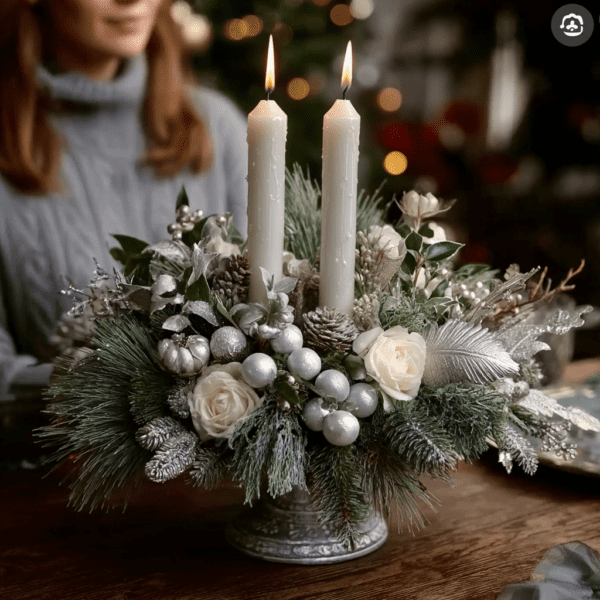 - Elegant Candle Arrangements: Nothing says ‘cozy winter night’ like candlelight. Our smaller arrangements featuring elegant taper or pillar candles are perfect for creating a warm and inviting atmosphere.