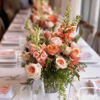 This arrangement is so soft and romantic. It uses gentle peach and blush colours to create a warm and graceful feeling at your tables. It’s perfect for an elegant and inviting wedding.
