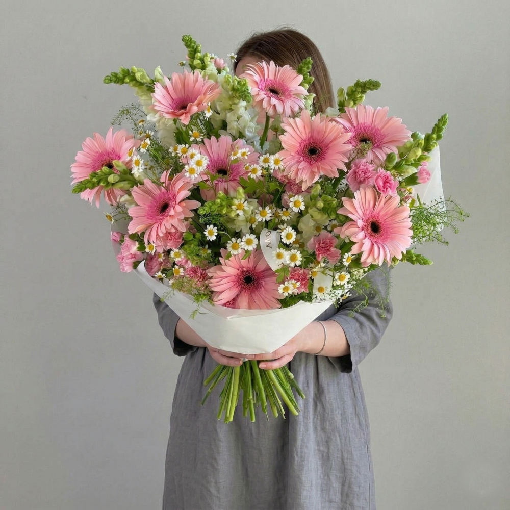 At the centre, you’ll notice the open pink daisy-like blooms that give the bouquet its structure. They bring a gentle brightness without being loud. Around them, smaller white and yellow accents create contrast and keep everything feeling light. There’s a mix of textures throughout—some airy, some more structured—which gives the bouquet a relaxed, garden-picked look instead of a tightly packed, formal feel.