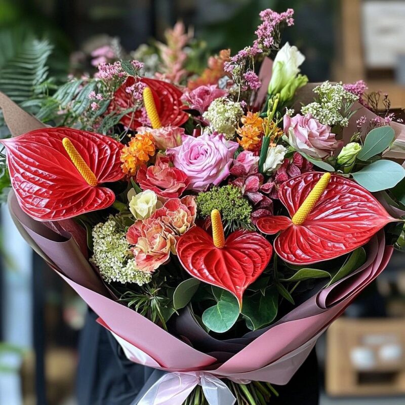 At the heart of the arrangement are bold red anthuriums, adding richness and a striking focal point.