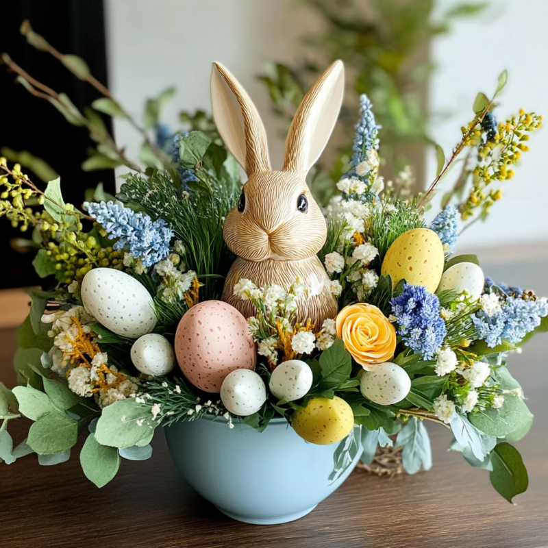 Bunny Bowl Blossoms features a delightful ceramic bunny surrounded by lush spring florals, bright yellow roses, blue statice, baby’s breath, and sprigs of mimosa and greenery. Nestled throughout are speckled Easter eggs in cheerful shades of pink, yellow, white, and green, creating a playful centerpiece that brings a smile to every age. Whether for an Easter table or a thoughtful seasonal gift, it delivers spring magic in full bloom.