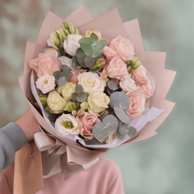 This elegant bouquet is a delicate blend of blush and ivory roses, white lisianthus, and creamy spray roses, complemented by cool eucalyptus sprigs. Wrapped in pale mauve and champagne-toned paper and finished with a satin ribbon, itโs a gentle expression of affection, admiration, and thoughtful intent. Whether for birthdays, anniversaries, congratulations, or a quiet โthinking of you,โ this bouquet captures beauty in its most timeless form.