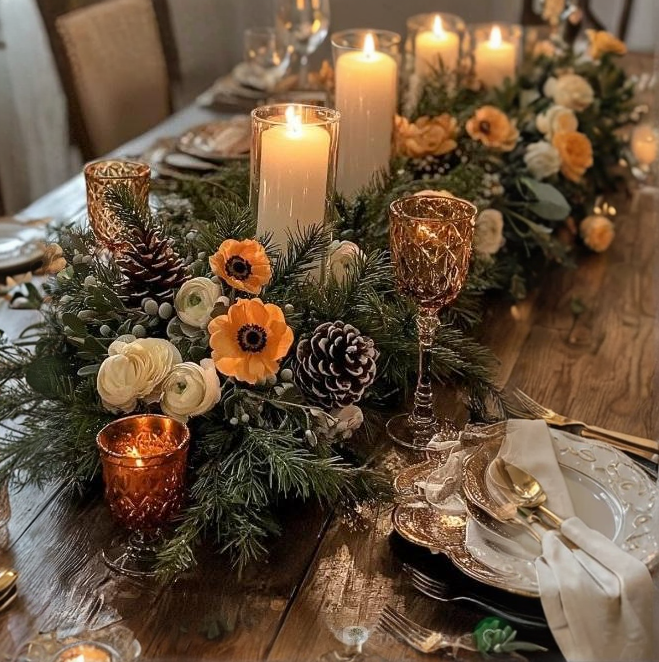 Set your table aglow with a christmas live greens runner, lush evergreens, soft blooms, and candlelight creating a warm holiday welcome.