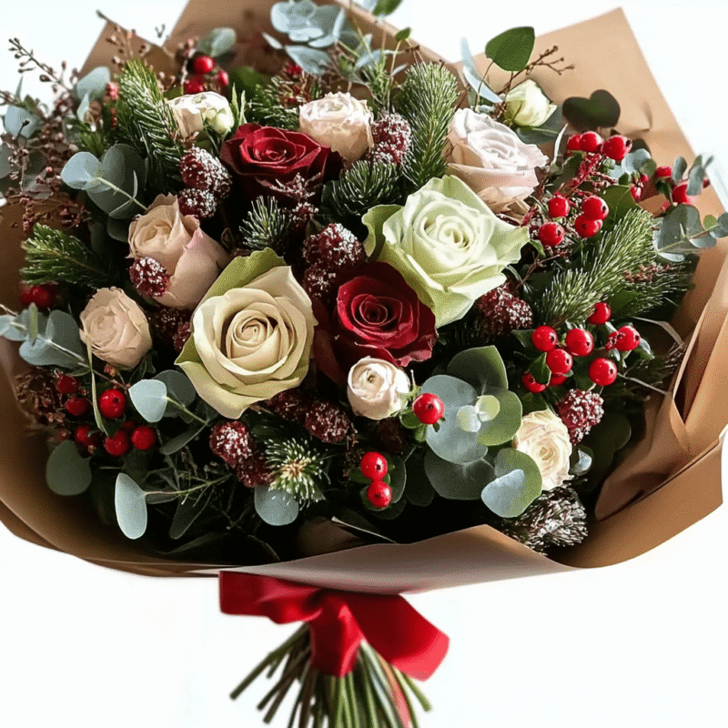 Bring a timeless touch of holiday cheer with this enchanting bouquet. Featuring a harmonious mix of red and white roses, seasonal greenery, and festive accents like crimson berries and shimmering baubles, this arrangement radiates warmth and joy. Wrapped in rustic kraft paper and tied with a classic red ribbon, it’s the perfect gift to celebrate the magic of Christmas.