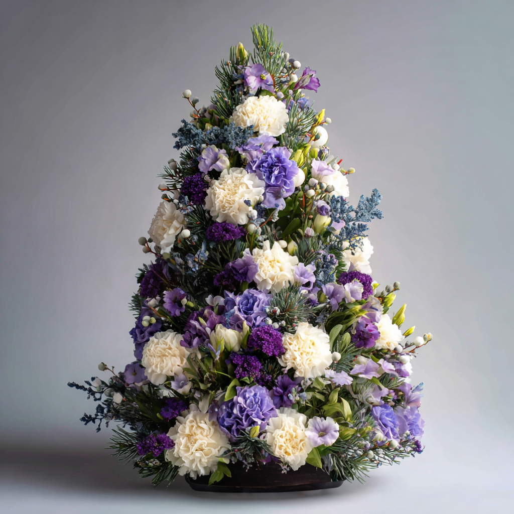 Meet our frosted evergreen tabletop tree, shaped with fragrant pine, white carnations, violet lisianthus, and delicate berries. Mixed textures create a snowy woodland mood that feels both modern and nostalgic, like a walk through twilight firs. Thoughtfully sized for mantels, sideboards, console tables, and desks, this piece brings the cheer of christmas floral arrangements to spaces where a full tree wonโt fit.
