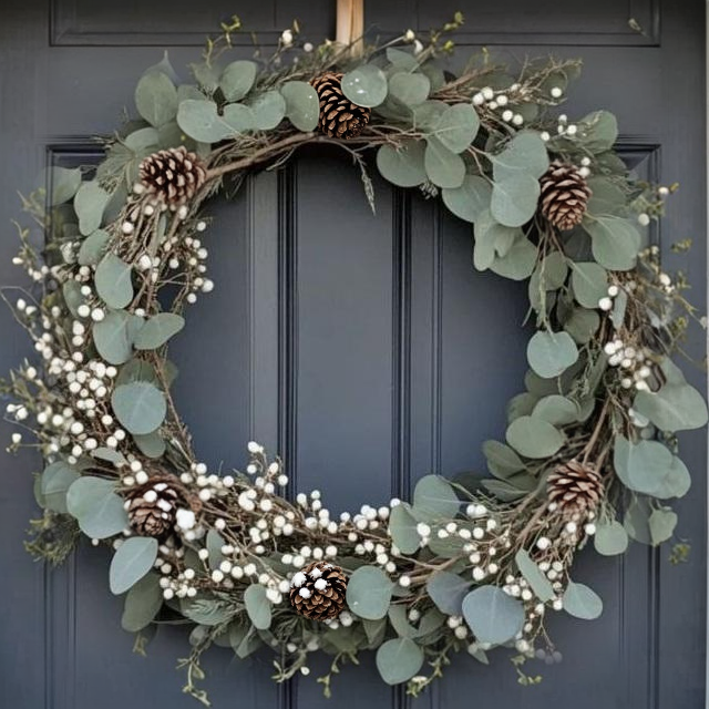 Soft sage eucalyptus leaves mingle with textural twigs, creamy white berries, and cozy cones for a wreath that feels like a quiet walk through a frosted grove. The look is airy and refined, ideal for homes that lean minimalist yet want the warmth of tradition. Whether you hang it on a navy door, style it over a mantel, or set it flat with candles, this piece plays beautifully with christmas arrangements and reads as calm, chic, and welcoming from the very first glance.