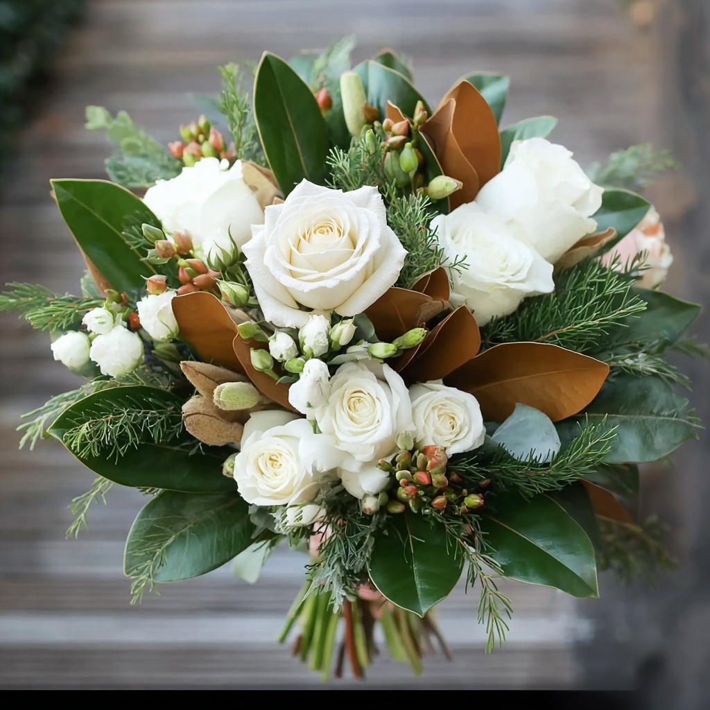 Graceful and fragrant, this seasonal bouquet celebrates the beauty of winter with creamy roses nestled among glossy magnolia leaves and cool evergreens. The contrast of deep green and warm copper leaf backs creates a quietly luxurious palette that feels at home in modern spaces and traditional interiors alike. Wrapped in crisp tissue and ribbon, itโs ready to place in a vase or to present as a thoughtful gift alongside your favorite christmas arrangements. The look is intentionally timelessโsoft, luminous, and easy to style beside twinkle lights, candle glow, or a simple linen runner on the dining table.