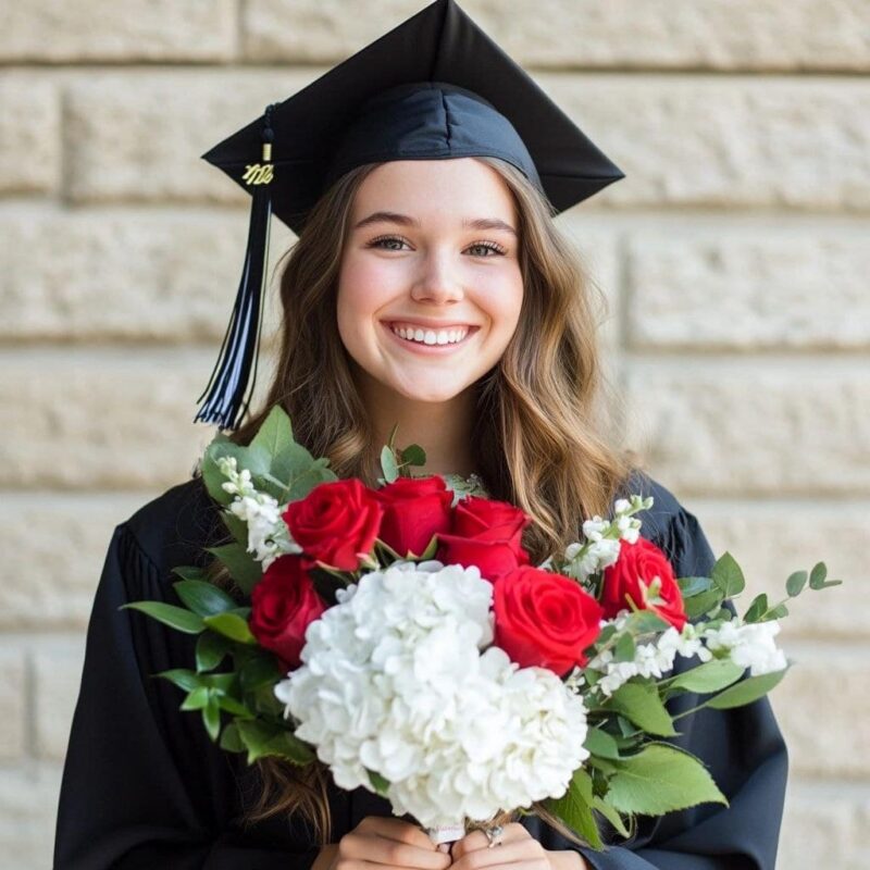 This graduation bouquet is ideal for both formal and casual celebrations, and it complements any setting, from stage photos to backyard parties. The contrast of the red and white makes it universally flattering, and the sturdy nature of hydrangeas and roses means it will hold its shape throughout the dayโs activities. Itโs as durable as the student it honors and as elegant as the future that lies ahead.