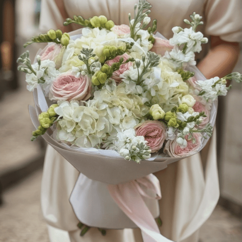 - Fluffy White Hydrangeas: These create a lush, cloud-like base for the whole arrangement.