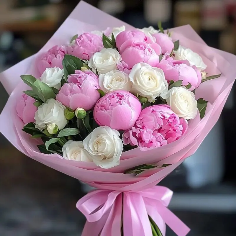 Peonies are among the most beloved flowers in the world, often symbolizing romance, prosperity, and happy marriage. Their large, layered petals and soft fragrance make them a showstopper in any floral design. Paired with the classic purity of white roses—symbols of love, sincerity, and grace—this bouquet becomes a heartfelt message in floral form. It’s perfect for anniversaries, birthdays, engagements, or even as a luxurious way to say thank you or “I miss you.”