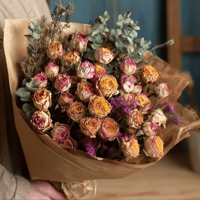 Invite this dried roses bouquet into your everyday rhythm. Add a heartfelt note for the card, choose delivery details, and let us prepare a keepsake that arrives ready to live gracefully in your space. It asks little, offers much, and turns ordinary corners into small sanctuaries—rose ruffles, eucalyptus silver, and the kind of beauty that lingers without demanding attention.
