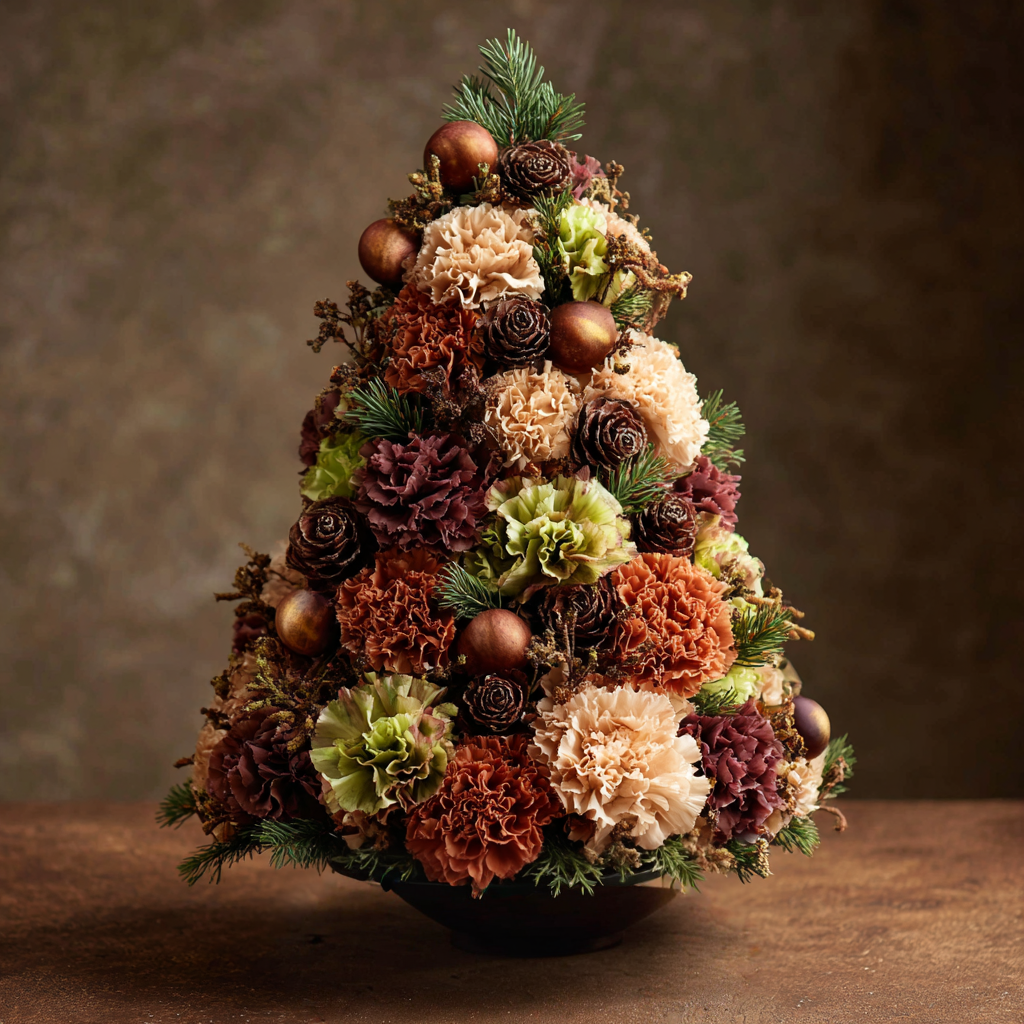 Imagine the glow of a fireside evening captured in flowers. This sculpted mini evergreen layers fragrant pine with ruffled carnations in copper, mocha, cream, and fig tones, then tucks in cedar, seed pods, and tiny pinecones for texture. Burnished baubles add a soft metallic glimmer, while mossy greens keep everything grounded and natural. The shape is classic and welcoming, a tree you can set anywhereโon a console by the door, an accent table beside the sofa, or at the center of a holiday buffetโbringing the comfort of christmas arrangements to intimate spaces. Ease is the promise: place it, admire it, breathe in the forest scent, and feel your home relax.