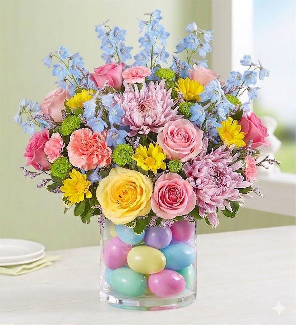 Easter bouquet Vancouver feels bright, playful, and full of life with our Candy Pastel Easter arrangement. Designed in a clear glass vase filled with soft-coloured decorative eggs, this piece blends vibrant spring flowers with a lighthearted seasonal detail that instantly draws attention. It’s cheerful, modern, and made to bring energy into any space.