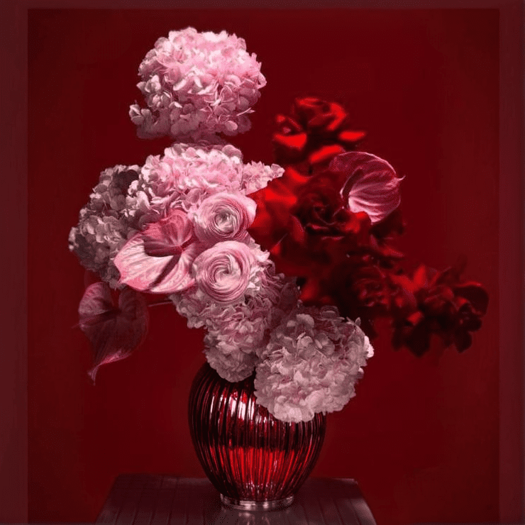 Designed as a refined statement of love, this bouquet brings together luxurious red roses, delicate pink hydrangea, sculptural anthurium, and layered ranunculus in a dramatic yet balanced composition. The contrast between rich crimson shades and gentle pastel pink creates a visual story of passion softened by tenderness. This thoughtful combination makes the arrangement ideal for Valentine’s Day, when emotions are layered and meaningful rather than one dimensional. Every flower is chosen to contribute not only color, but also symbolism and emotional depth.