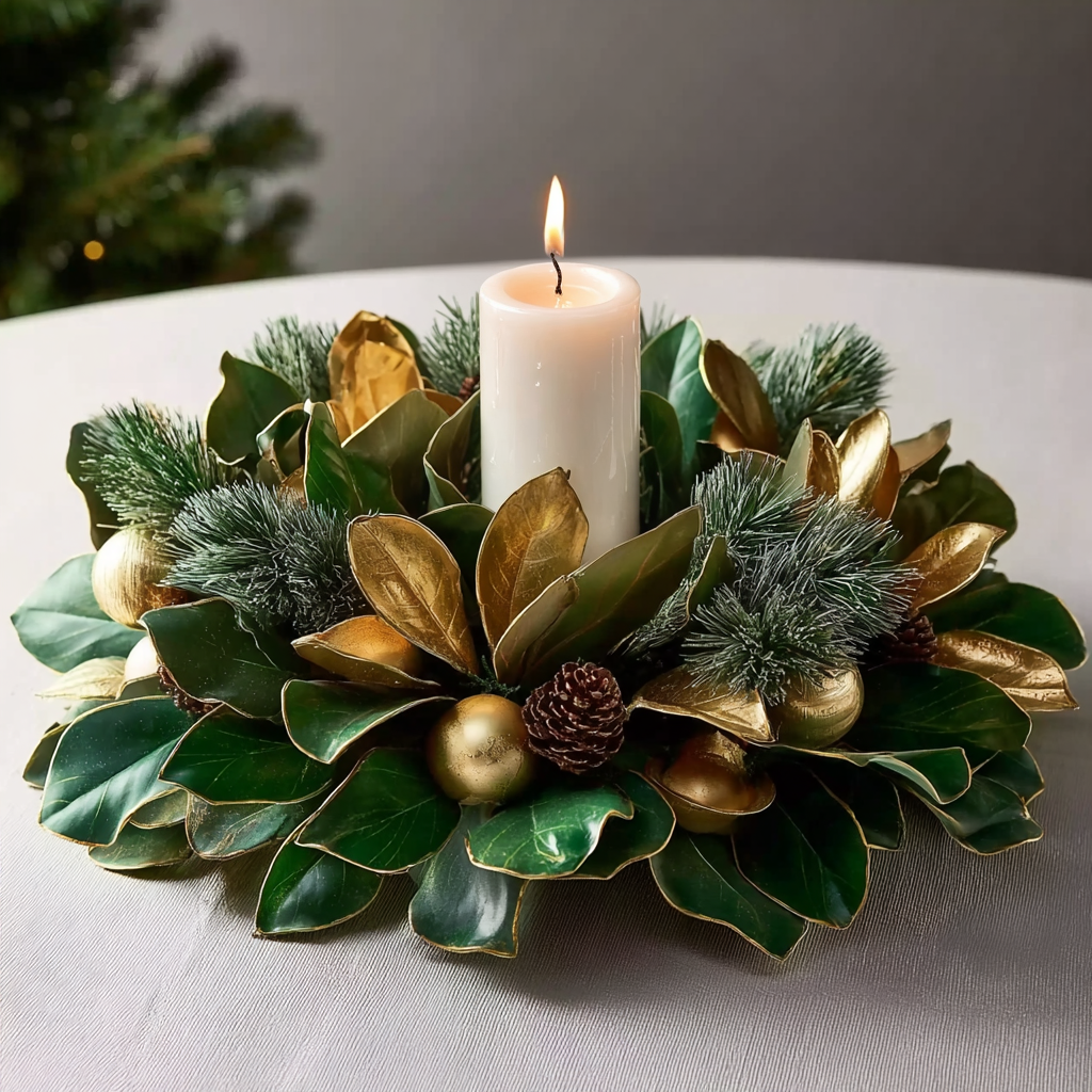 Imagine the hush of a winter evening as candlelight pools across glossy magnolia leaves and soft evergreens. This design gathers noble fir and cedar around a single pillar, then tucks in pinecones, pearl ornaments, and hand-tinted gold foliage for an elegant balance of woodland and glamour. Crafted low and circular, it welcomes conversation and fits beautifully on dining tables, consoles, or coffee tables without crowding the setting. If your style leans toward classic christmas arrangements with a modern twist, this piece becomes the quiet star of the seasonโgraceful by day and luminous by night.