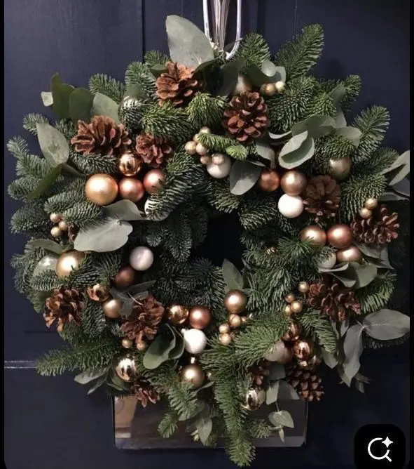 Hand assembled by our design team, each branch is placed for depth and movement, so your wreath reads plush from every angle. The eucalyptus softens the evergreens and adds that crisp, spa like fragrance people love, while pinecones contribute texture and natural warmth. Polished baubles in bronze, copper, and pearl echo the glow of evening lamps, harmonizing effortlessly with christmas floral arrangements elsewhere in your home. Hang it solo for simplicity or layer with ribbon for a custom accent that complements both classic and modern christmas centrepieces on the dining table.
