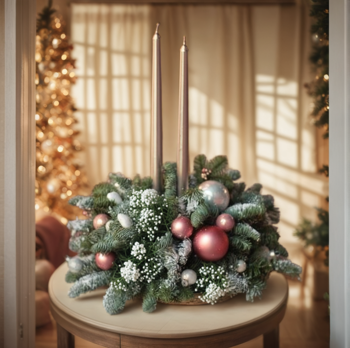 Imagine opening the door to a whisper of winter forest: noble fir, cedar, and spruce shaped into a lush ring, flecked with silvery frost, and crowned by two taper candles that shimmer like quiet stars. This centerpiece is designed for people who love christmas arrangements with texture and elegance, especially hosts who want a piece that flatters conversation rather than interrupting it. The form is low and generous, perfect for christmas dining table centrepieces where plates, glasses, and laughter need room to mingle. Glossy ornaments in rosy and champagne tones nestle between branches, while delicate clusters of babyโs breath echo snowfall and pair effortlessly with bouquet christmas flowers elsewhere in your home.