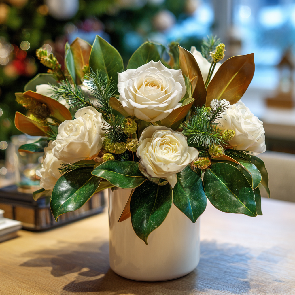 An elegant christmas flower bouquet in a modern vase pairs ivory roses with magnolia and evergreens for calm seasonal glow.