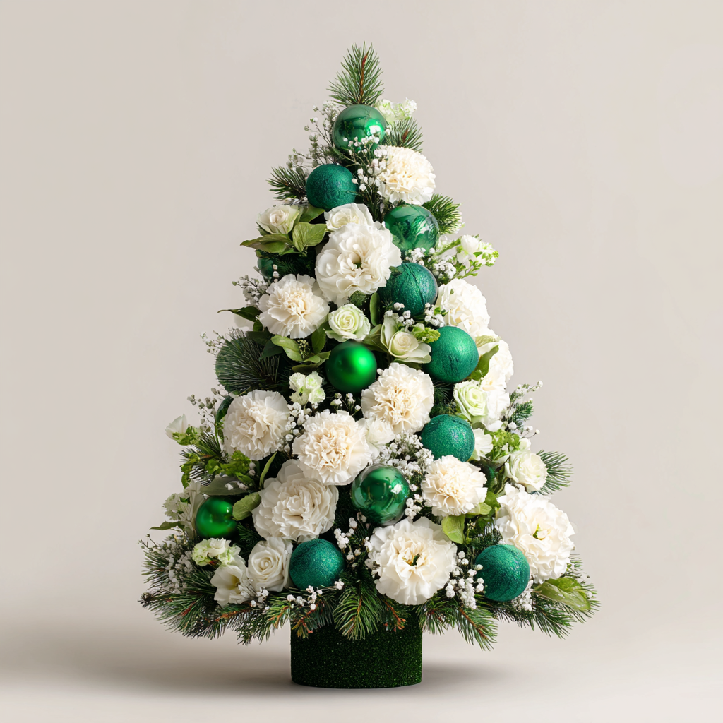 Meet our tree-shaped design: a fresh christmas flower centrepiece that pairs creamy blooms with evergreen sparkle and glossy emerald ornaments.