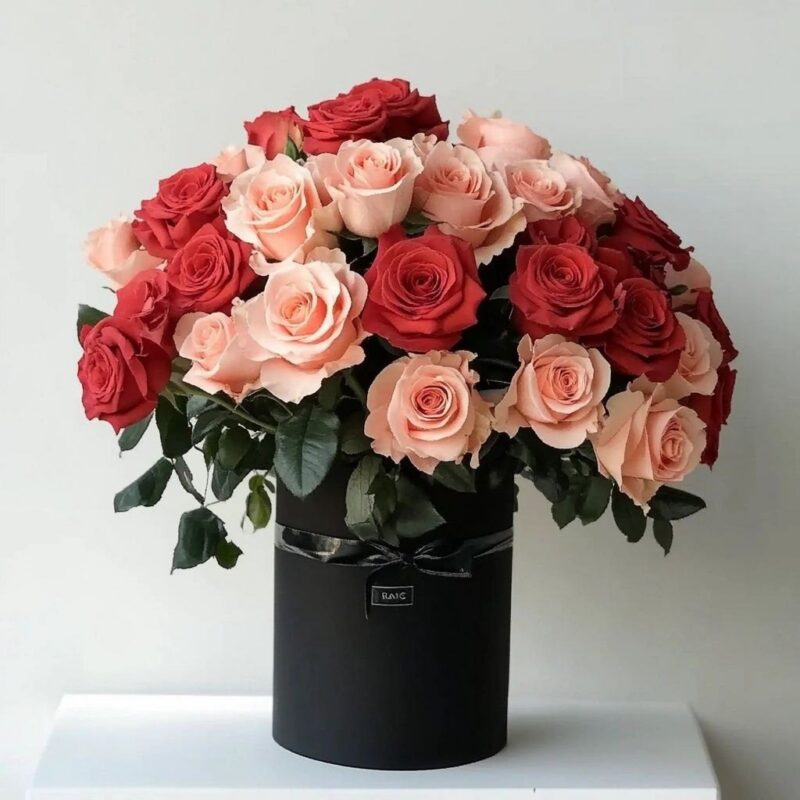 This elegant red and peach roses arrangement is a refined expression of love and admiration. The deep red roses symbolize passion, while the soft peach roses exude warmth and gratitude. Presented in a chic black box, this luxurious floral display is perfect for making a grand and unforgettable impression.