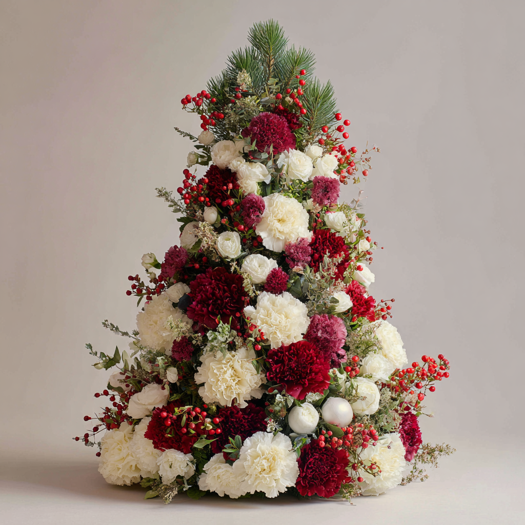 This sculpted tabletop evergreen brings classic holiday romance to any room. Plush ivory carnations mingle with deep merlot blooms, creamy spray roses, and cheerful red berries, all woven through fragrant pine and cedar. The result is a layered Christmas tree silhouette that feels both refined and welcoming, perfect for mantels, consoles, kitchen islands, and sideboards. If you adore christmas floral arrangements but want something compact and easy to place, this design delivers a generous dose of cheer without crowding your space. We build each tree by hand so it looks beautiful from every angle and photographs like a dream beside candlelight.