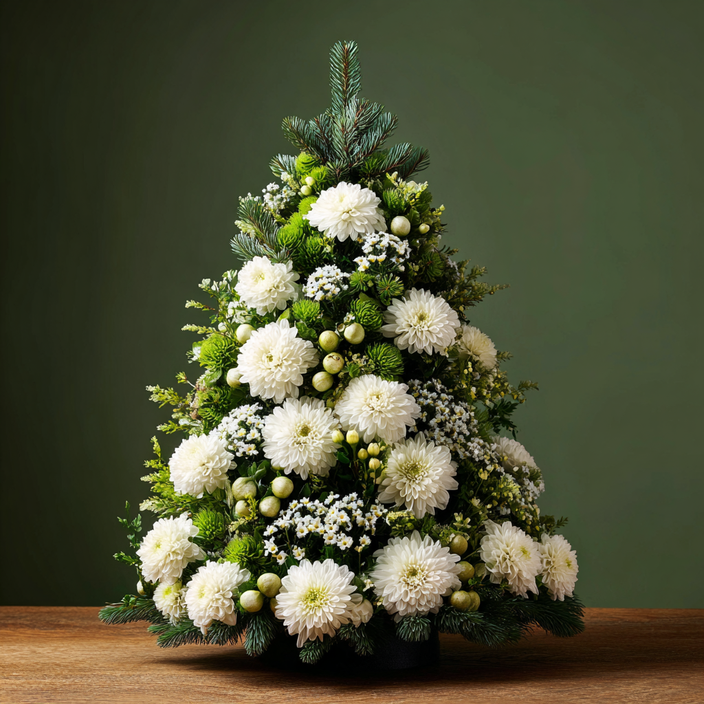 Elevate your table with a graceful christmas flower centrepiece shaped like a snowy mini tree in white blooms and forest greens.