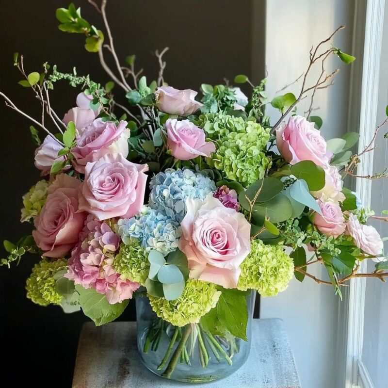 - Fluffy Hydrangeas: A mix of soft green and blue hydrangeas adds lush depth and texture.
