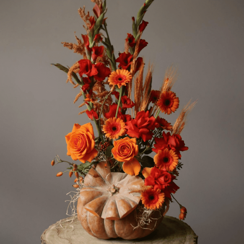 A bold Thanksgiving pumpkin arrangement with roses, gladiolus, gerbera, and wheat, rising like autumn flames from a real pumpkin base.