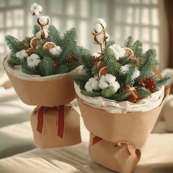 Gifting is effortless. Wrapped in kraft with crisp tissue, the bouquet travels well and fits perfectly into apartment livingโideal for friends, colleagues, and hosts. Customers searching for christmas bouquet vancouver options often want something that lasts through a weekend of gatherings; evergreens hold their shape for weeks, and the cotton, cones, and citrus dry gracefully. Include a short note suggesting the recipient reuse the kraft wrap for gift tags and the dried oranges for garlandsโlittle sustainable touches that feel thoughtful and clever.