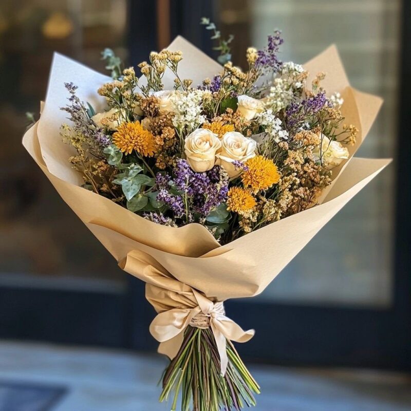 At its heart, vibrant orange chrysanthemums are complemented by delicate yellow ranunculus, while soft cream roses add a touch of elegance. Accents of blue thistle provide a striking contrast, adding depth and texture to the arrangement. Surrounding the focal blooms are a variety of dried grasses and foliage, including eucalyptus and fern-like greenery, which give the bouquet an organic, wildflower feel. Wrapped in natural brown paper and finished with a chic dark green bow, this arrangement is perfect for those who love a mix of modern and natural beauty.