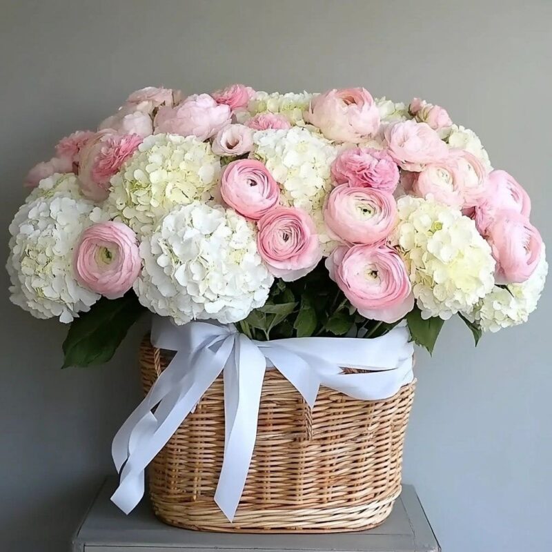 A Hydrangea and Ranunculus Arrangement that embodies pure elegance and charm. This exquisite display features lush white hydrangeas paired with delicate pink ranunculus, all nestled in a rustic wicker basket and adorned with a flowing satin ribbon. Perfect for sophisticated celebrations, heartfelt gifts, or adding a touch of romance to any space.