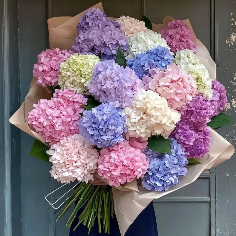 This hydrangea bouquet in pastel shades is the perfect gift for any occasion. Its soft hues of blue, pink, lavender, and green create a dreamy and elegant arrangement, making it ideal for celebrations, romantic gestures, or simply brightening someone’s day.