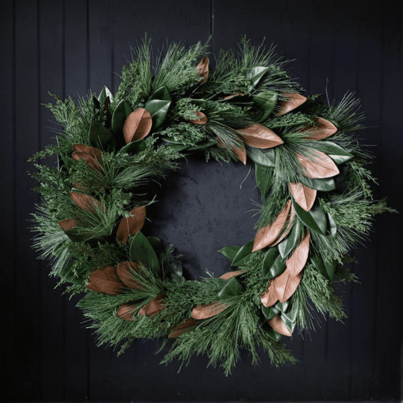 Love a little DIY? Use this circle as your mood board for how to make a chrismas wreath. Start with a grapevine ring, then wire small bundles of mixed evergreen. Layer them in one direction for a clean sweep, staggering magnolia clusters so the copper backs peek through. Keep the center open and generous so the ring feels airy, not crowded. A relaxed ribbon knot finishes the look. Display your handmade version beside this one for a โcollected over timeโ story that feels boutique and personal.