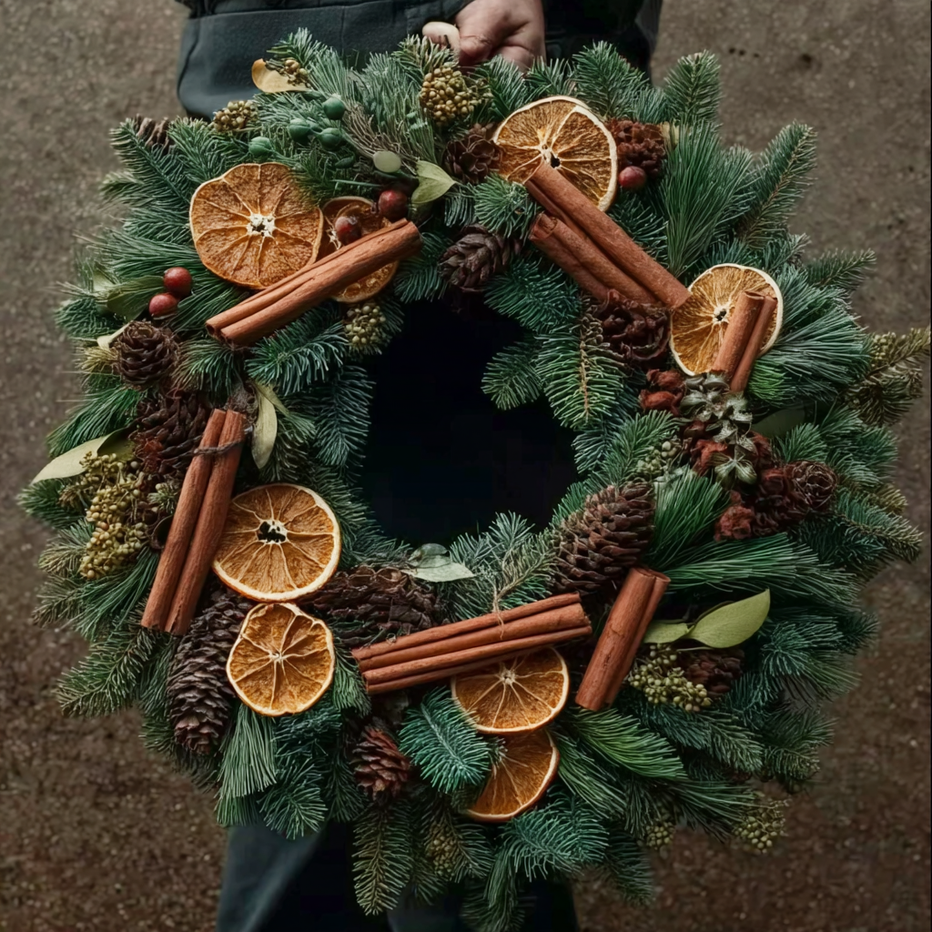 Meet our large chrismas wreath, a fragrant circle of citrus, cinnamon and evergreen that brings cozy cheer to doors and tables.