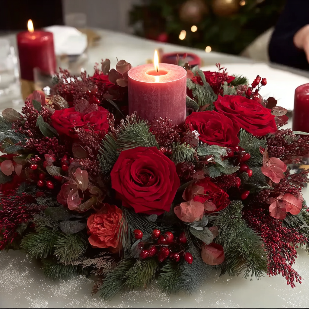When festivities wind down, transition into winter in minutes. Remove the most festive ornaments, keep the evergreens, berries, and candle, and enjoy a calm, fireside mood well into January. The greens remain handsome with cool temperatures and occasional misting, and the roses can be refreshed as needed so the piece continues to feel full and inviting. Whether it crowns a linen-draped feast, brightens a coffee table, or anchors a buffet beside other christmas centrepiece decorations, this christmas candle centrepiece gives every gathering a halo of light, a breath of forest, and the romantic glow of rosesโholiday magic made beautifully easy.