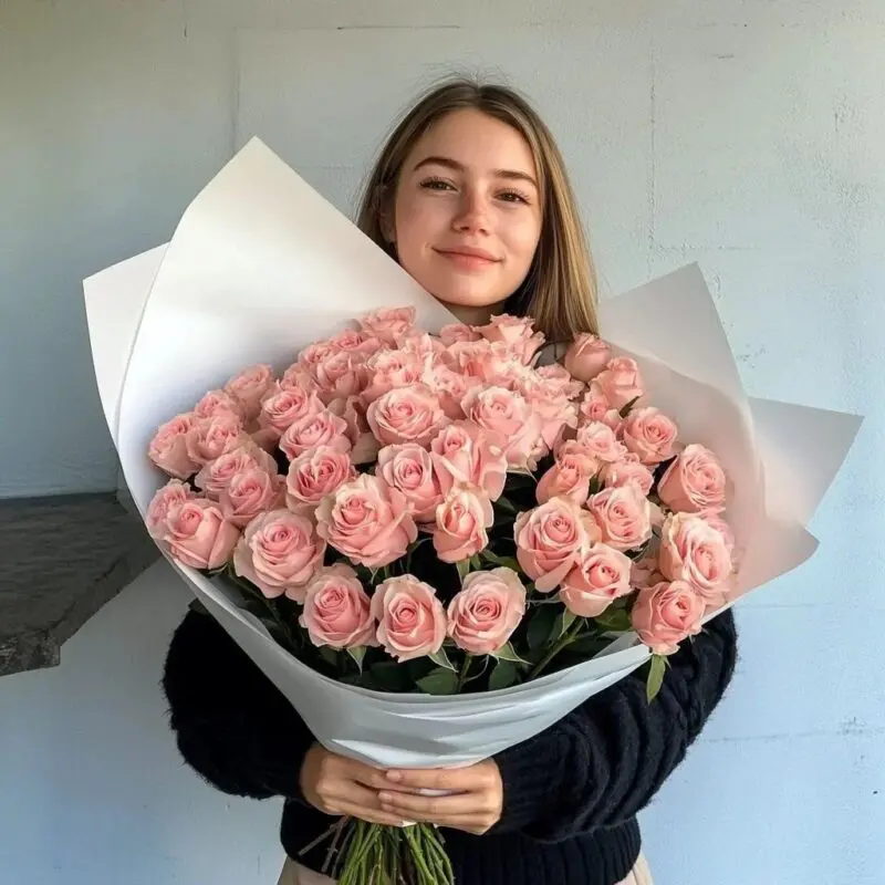 This luxury pink roses bouquet is the perfect expression of tenderness and sophistication. Featuring lush, pastel pink roses, it conveys admiration, affection, and timeless beauty. Wrapped in elegant white paper, this bouquet is an exquisite gift for any heartfelt occasion.