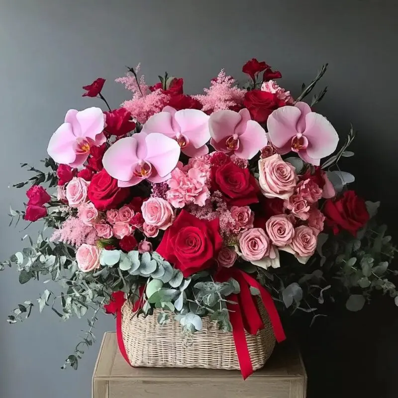 A Luxury Red and Pink Floral Arrangement designed to captivate with its bold elegance and refined beauty. Featuring deep red and blush pink roses, delicate pink orchids, and lush greenery, this opulent display is artfully arranged in a woven wicker basket with cascading eucalyptus for a sophisticated touch.
