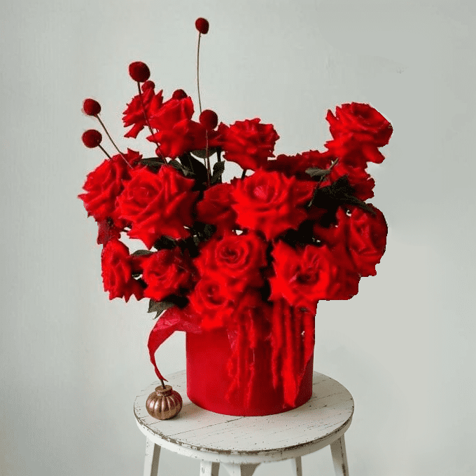Designed to make a confident and lasting impression, this bouquet brings together lush red roses arranged in a refined hat box that elevates the classic symbol of love. Red roses have always represented passion, devotion, and sincere affection, and this arrangement embraces that meaning with intensity and elegance. The deep red color feels powerful yet timeless, making this bouquet ideal for expressing strong emotions without the need for words. It is a statement of love that feels intentional, confident, and deeply romantic.