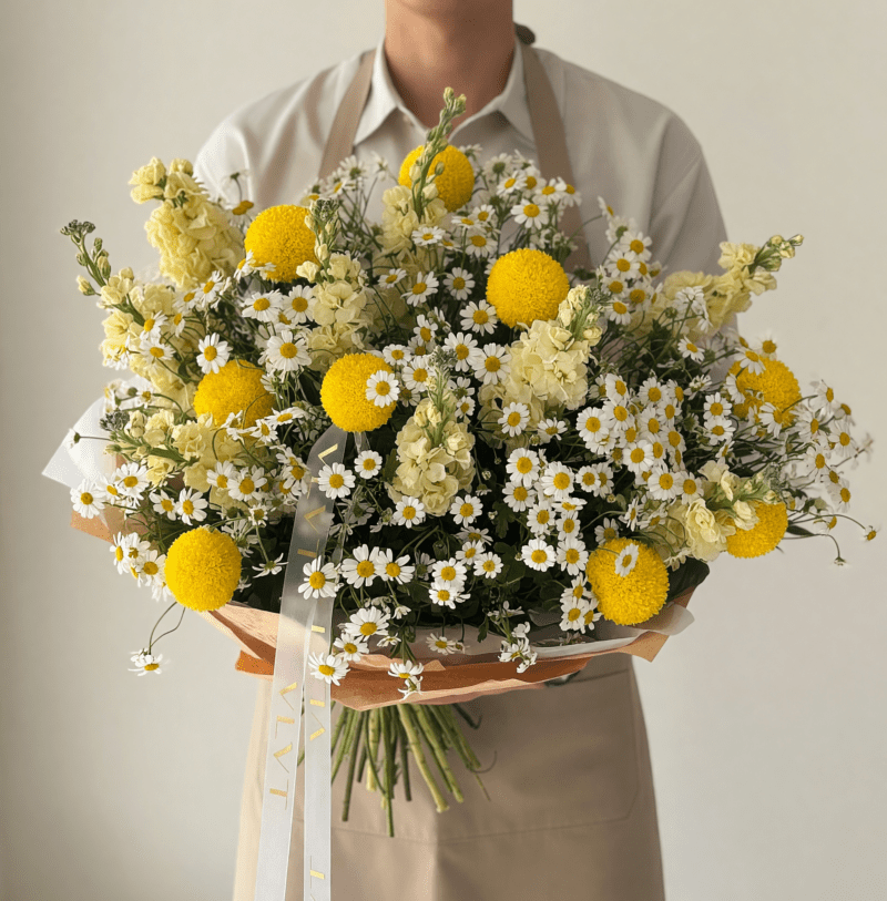 Mother’s Day flowers Vancouver often follow a polished, classic direction—but this bouquet leans into something more natural and effortless. The Chamomile Atelier arrangement is inspired by a wild meadow aesthetic, built around airy white daisies and soft yellow blooms that bring a sense of lightness and movement.