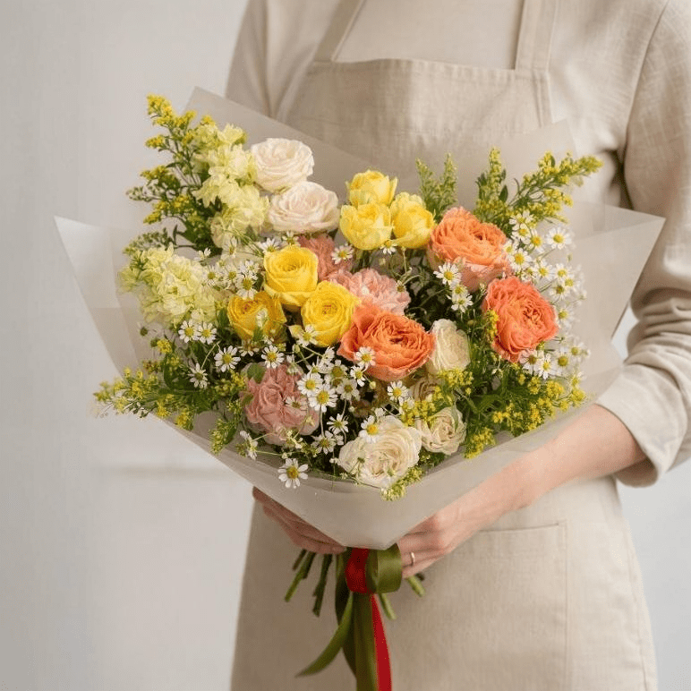 This arrangement has a natural, garden-inspired feel from the start. Yellow blooms introduce brightness and energy, while peach roses soften the palette and keep everything grounded. Small white daisies are scattered throughout, adding texture and giving the bouquet that slightly wild, just-picked look.