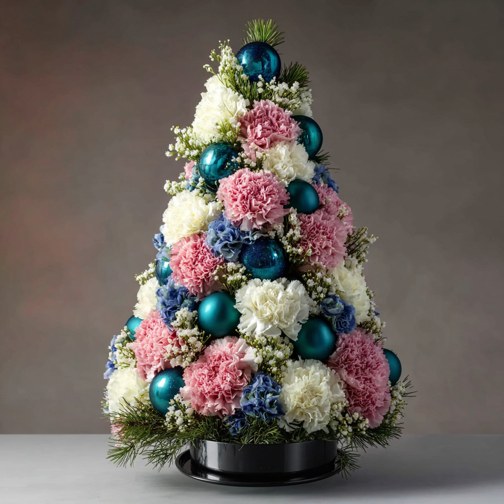 Imagine the sweetest winter fairytale, shaped into a petite evergreen tower and dotted with teal ornaments like little storybook moons. Clouds of creamy and pink carnations mingle with sky blue hydrangea and babyโs breath, while fresh pine at the base brings woodland fragrance to the room. This floral tree delivers the magic of christmas arrangements without requiring a full-size evergreen, making it easy to place on consoles, mantels, shelves, and sideboards. The palette feels playful yet elegant, a fresh twist on christmas floral arrangements that brightens grey days.