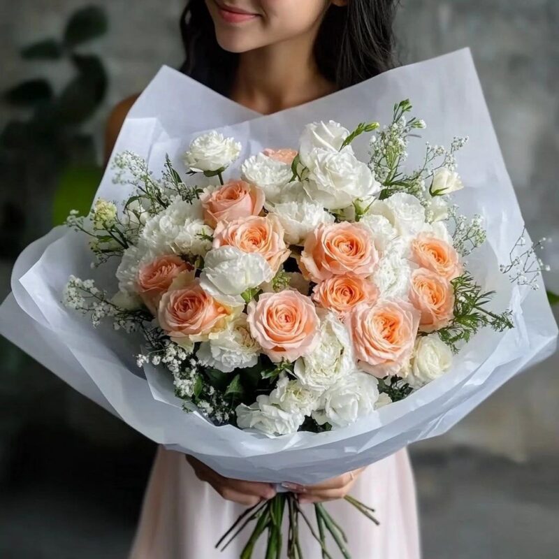 This peach and white roses bouquet is the perfect blend of elegance and tenderness, making it an ideal choice for romantic occasions. The soft peach roses symbolize admiration and gratitude, while the white blooms represent purity and sincerity, creating a heartfelt floral gift.