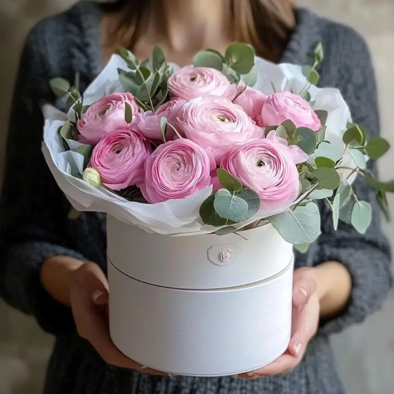 This pink ranunculus bouquet is the epitome of charm and elegance, presented in a sophisticated gift box. With delicate, layered petals in soft blush tones, ranunculus flowers symbolize admiration, romance, and new beginnings, making this arrangement a perfect choice for special occasions.