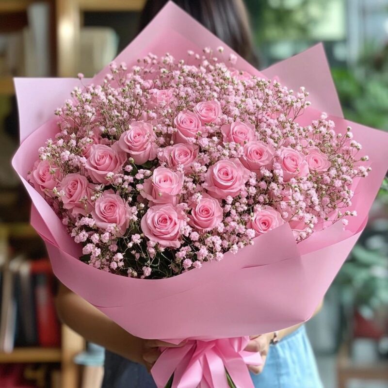 This is a stunning bouquet of Pink roses with pink baby’s breath (gypsophila). The roses are wrapped in soft pink paper, adding a charming monochromatic effect, while the neat arrangement and matching pink ribbon give it a polished and romantic look.