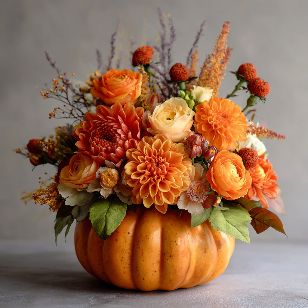 Meet the cheerful heart of your fall season. This low, full arrangement is designed in a real-look pumpkin vessel with a palette of cider orange, caramel, cream, and mossy green. Plush dahlias and ruffly ranunculus star at the center, while garden roses and playful button mums add layers of texture that feel cozy yet refined. We weave in berried accents, seed pods, and airy fall branches for movement, then tuck in eucalyptus and seasonal foliage to perfume the room with a fresh, woodsy note. The shape sits perfectly on dining tables without blocking conversation, and it photographs beautifully beside pie plates, candles, and your best linen napkins.
