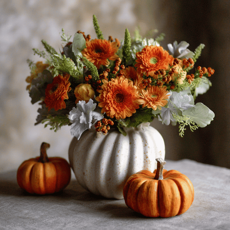 Hosting a gathering? This pumpkin posy sets the tone the moment guests step in from the crisp air outside. It flatters linen and stoneware, brightens wood tables, and looks beautiful alongside copper flatware and amber glass. After dinner, it moves effortlessly to a bedside table or desk, extending the celebration into the week. Sending it as a thank-you? The message is clear: “You’re appreciated,” expressed through color, texture, and a playful seasonal vessel that brings out smiles.