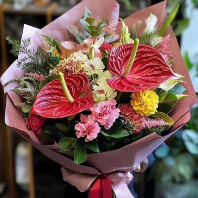 The bouquet is wrapped in elegant black paper, with hints of orange, adding a touch of sophistication while maintaining a celebratory feel. It’s the perfect way to convey heartfelt congratulations and best wishes for the retiree, celebrating their past achievements and the wonderful future that awaits them.