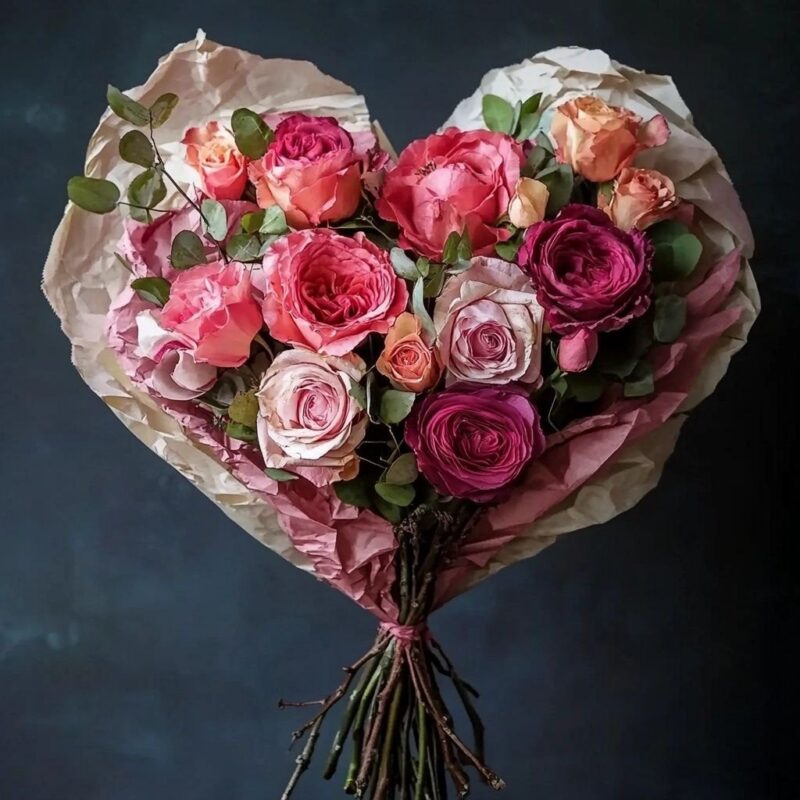 This bouquet features a rich palette of pink, peach, and deep magenta roses, skillfully arranged in a heart shape and nestled in rustic wrapping paper. Each bloom represents passion and affection, while delicate greenery adds a touch of freshness and balance. Perfect for Valentineโs Day, anniversaries, or any occasion where love takes center stage, this bouquet is a timeless symbol of devotion.