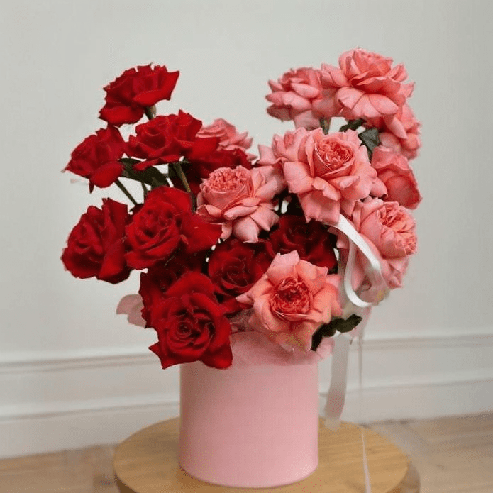 Designed for moments that deserve more than ordinary words, this bouquet brings together classic red roses and soft pink roses in a refined, romantic harmony. The contrast of colors creates a visual story of passion balanced with tenderness, making it an ideal choice for Valentine’s Day celebrations. Arranged in a modern round box, the flowers feel both luxurious and approachable, perfect for expressing emotions that are deep, sincere, and heartfelt.