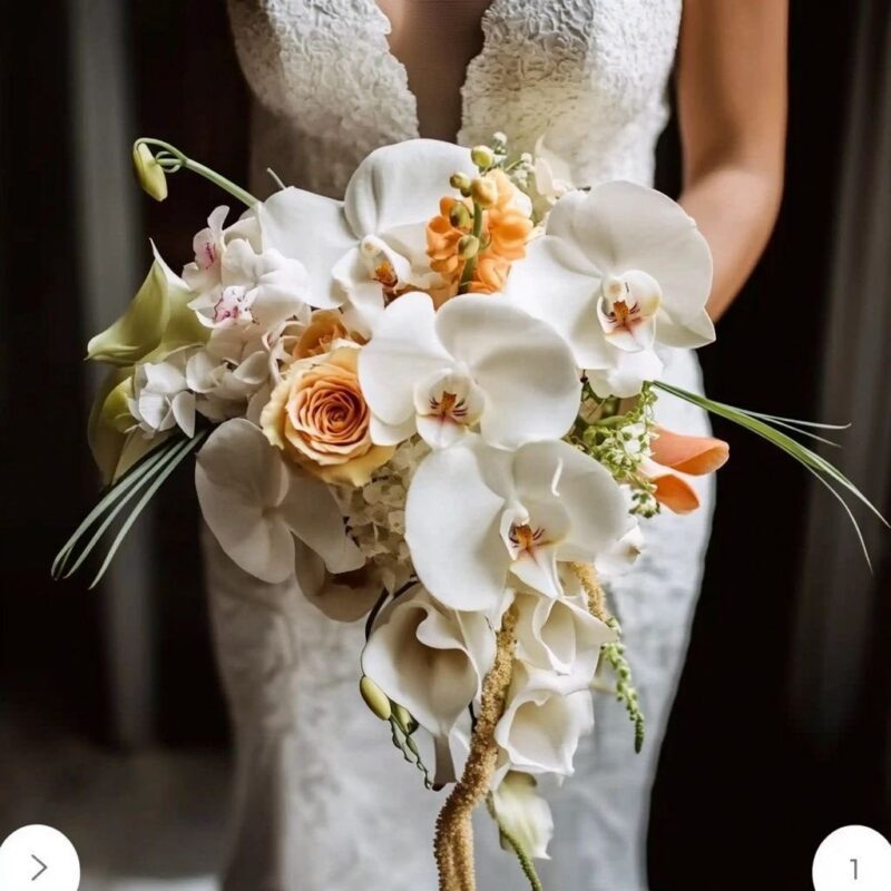 Wedding bouquet cost varies based on floral selection and design, and this exquisite cascading arrangement is worth every penny. Featuring lush white orchids, delicate ivory roses, and warm peach-toned blooms, this bouquet exudes elegance and sophistication, perfect for a modern bride.